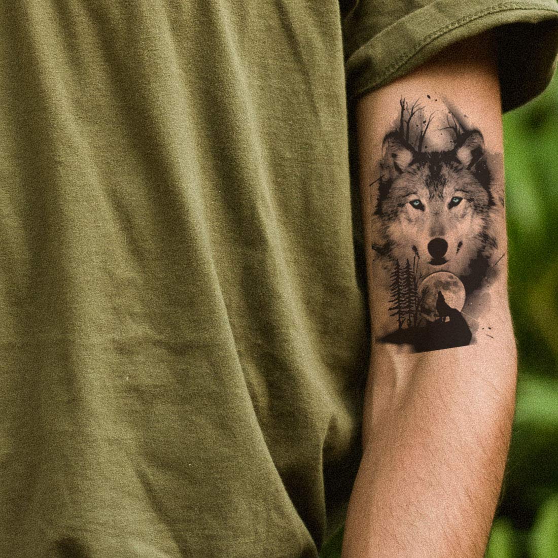 Black and Gray Wolf with Moon Temporary Waterproof Tattoo For Men and Women