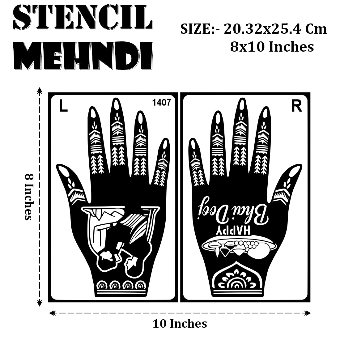 Happy Bhai Dooj Stencil Mehndi Sticker Design for Hands Brother-Sister Festival Heena Art Mehndi Featuring Ritual Plate, Diyas & Bhai Behan