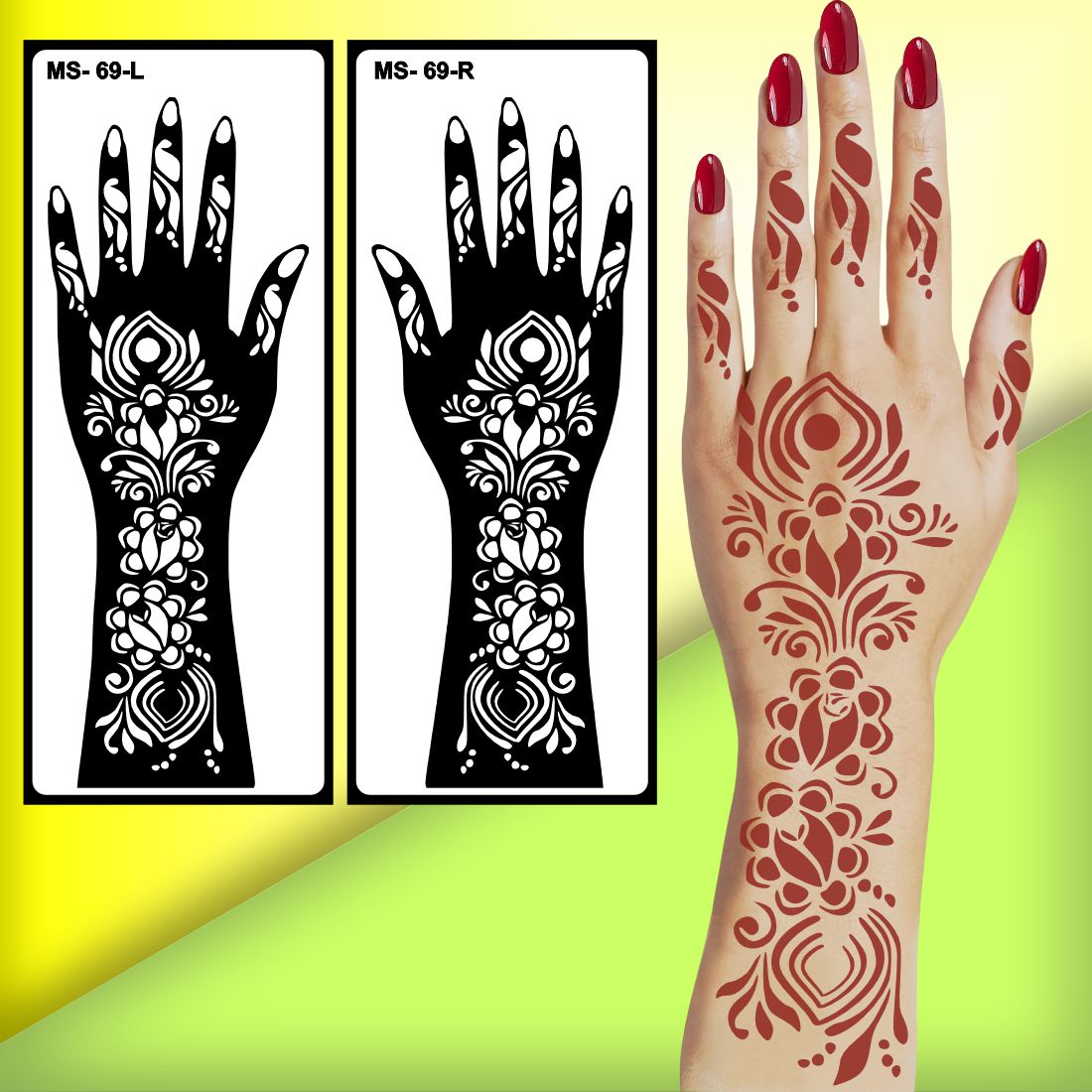 Enhance your traditional and festive look effortlessly with this beautifully crafted Stencil Mehndi Sticker. Designed for easy application and a professional finish, this stencil offers a quick, no-mess solution to achieve stunning mehndi designs on your hands. Whether you're preparing for a wedding, party, festival, or just love to decorate your hands with elegant henna art, this sticker stencil is your perfect companion. Crafted with precision-cut floral and ornamental patterns, this stencil is ideal for beginners and experts alike. Simply peel, stick, fill with henna, and peel off for an intricate design in minutes—no artistic skill required! The design includes finger detailing, wrist bands, and floral elements that elevate the overall appearance of your mehndi application. Safe for all skin types and made with high-quality material, it ensures a smooth, clean application every time. Perfect for girls, women, and teens who enjoy traditional beauty with modern convenience. Use it for special occasions like weddings, engagements, Diwali, Eid, Raksha Bandhan, or even for fun, casual styling.